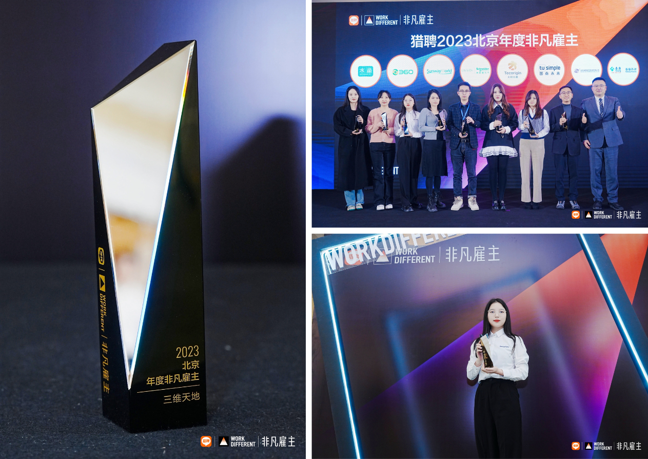 在市場競爭日益激烈的背景下,企業必須保持持續的探索和創新,以吸引和留存優秀的專業人才,從而在競爭中保持領先地位。三維天地獲得獵聘2023北京年度非凡雇主獎項,是對公司在年度人力資源管理實踐上的高度肯定和表彰,充分彰顯了三維天地在人才發展戰略和企業文化建設等方面的卓越實力與成績。