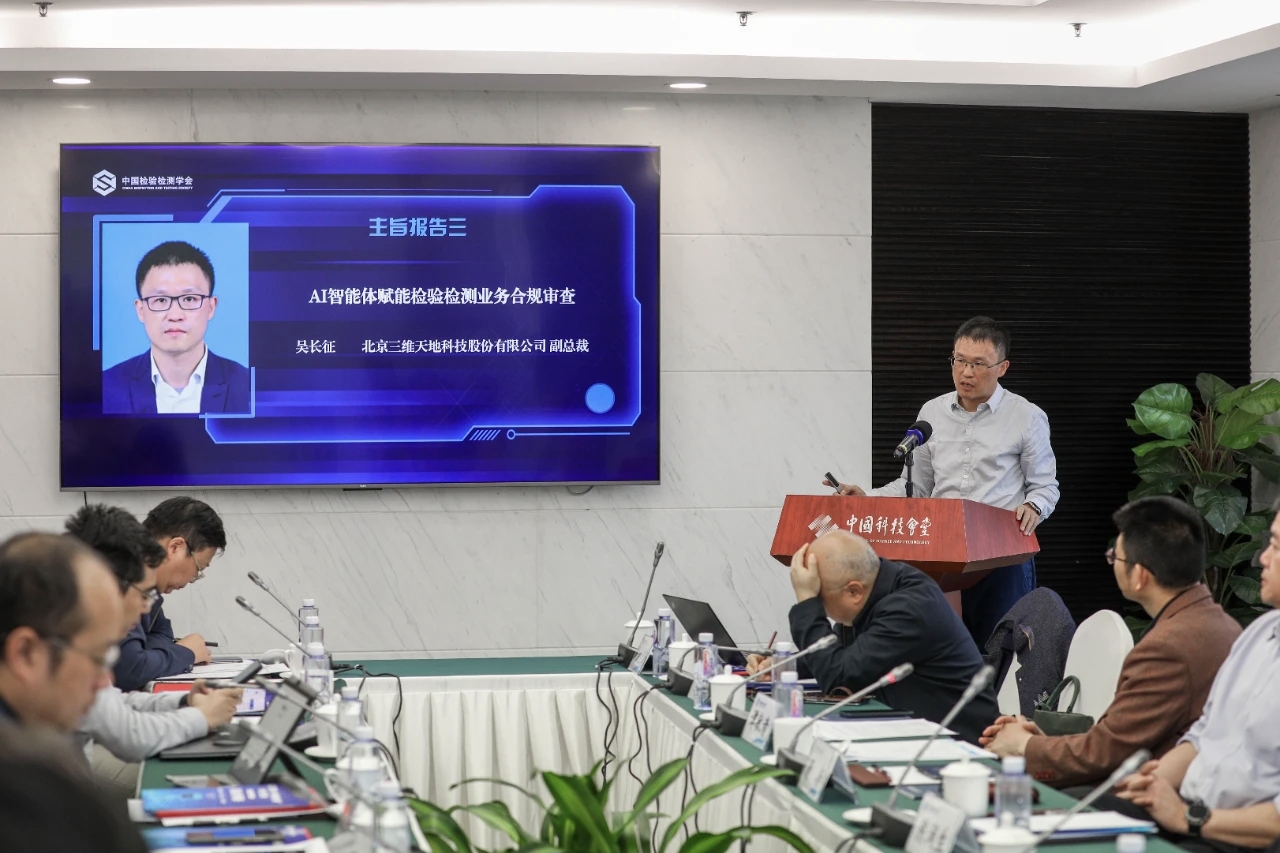 下午的研討在中國科技會堂舉行,議題聚焦“人工智能+檢驗(yàn)檢測”的科學(xué)前沿、治理挑戰(zhàn)與產(chǎn)業(yè)創(chuàng)新。三維天地副總裁吳長征發(fā)表了題為《AI技術(shù)在檢驗(yàn)檢測合規(guī)及資質(zhì)技術(shù)評審中的應(yīng)用》的主旨報告。